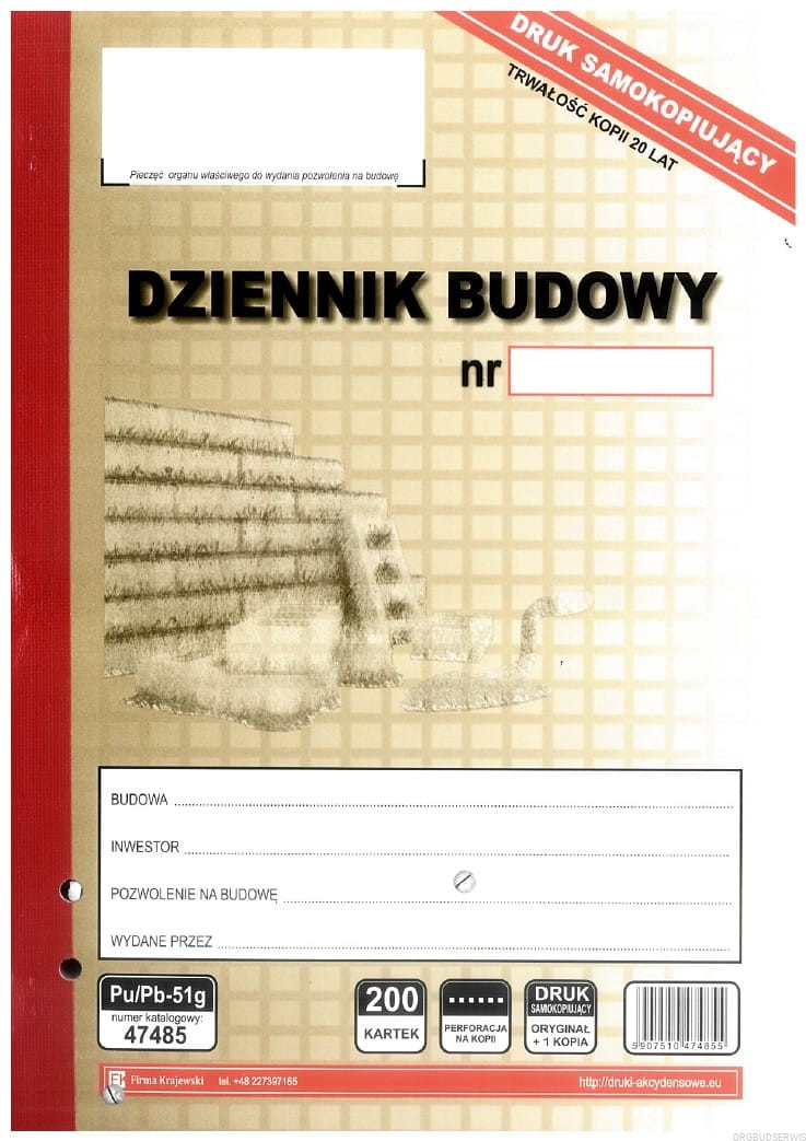Dziennik Budowy samokopiujący, w trwałej i bardzo wygodnej w użytkowaniu oprawie, 200 kartek (100+100).